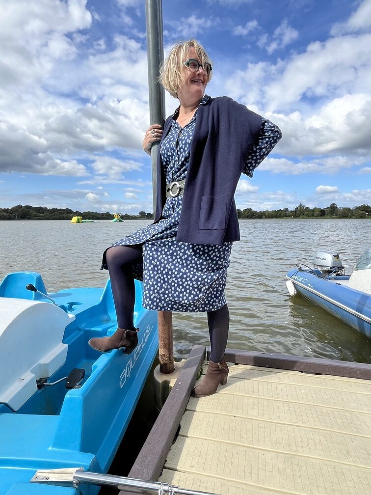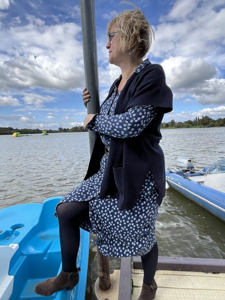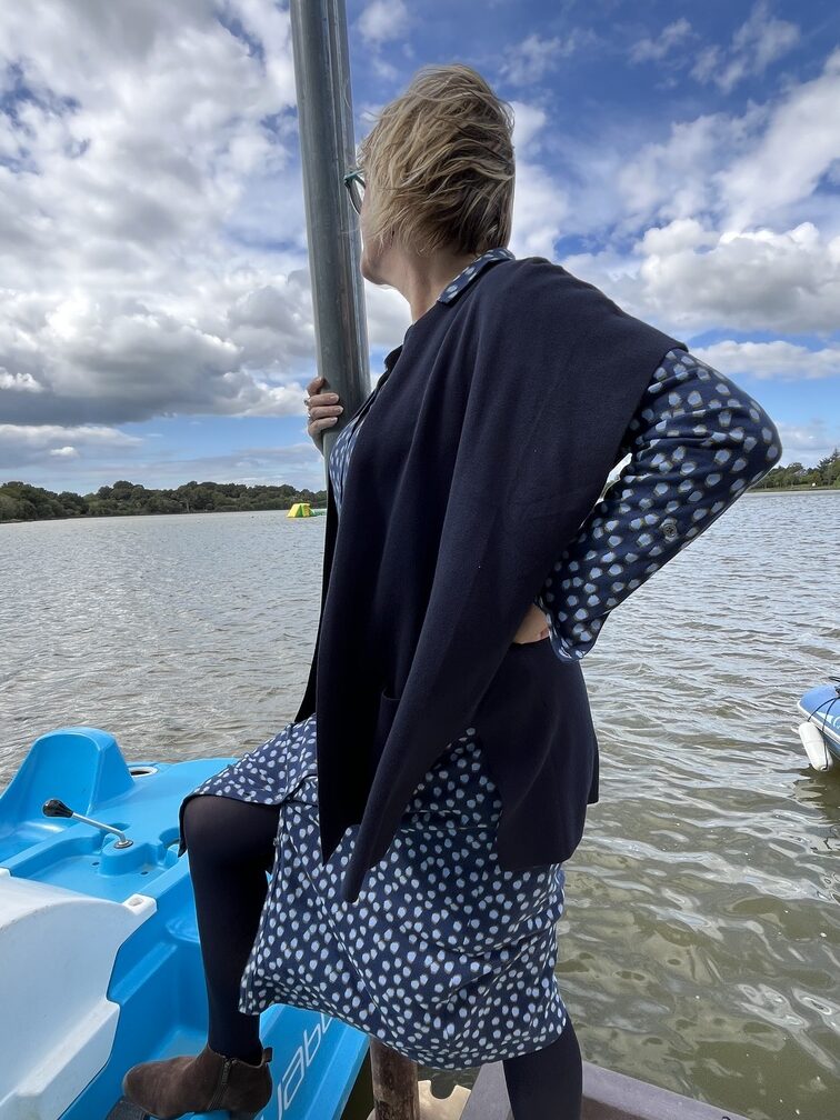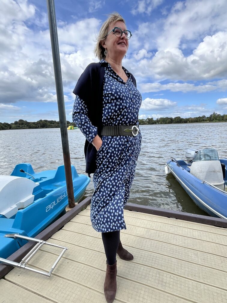 robe longue boutonnée en jersey imprimée bleu et son gilet sans manches assorti, pour une tenue confortable et facile à porter au quotidien. Ceinturée elle s'adaptera à toutes les morphologies !