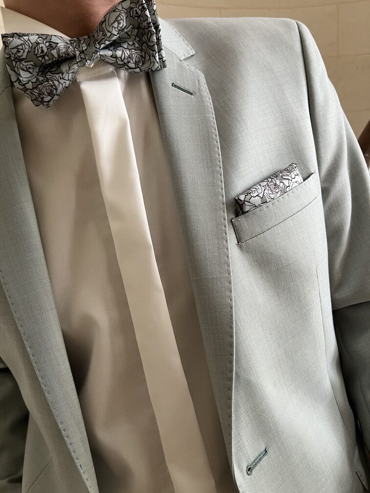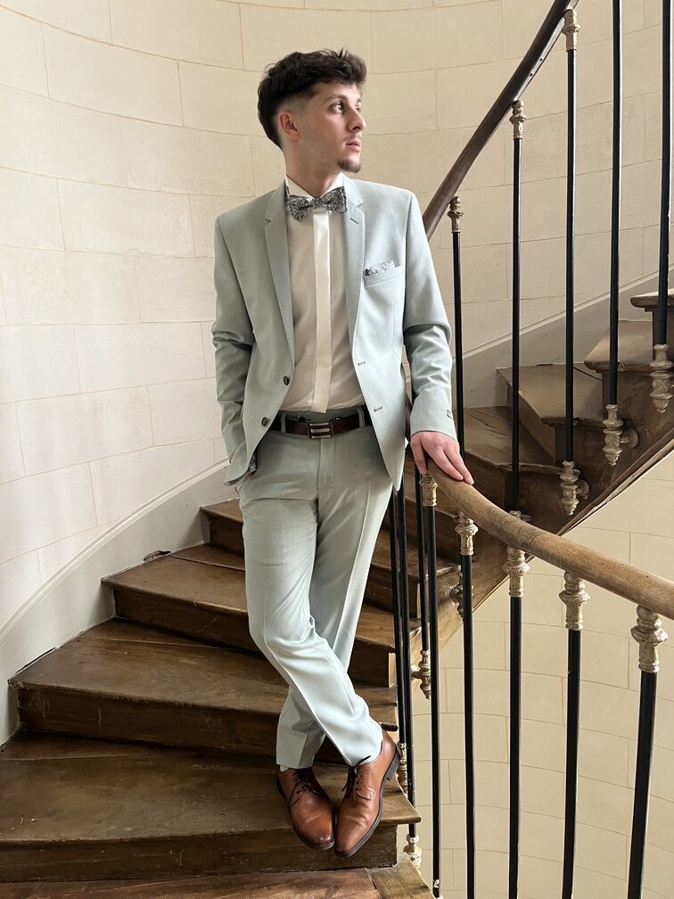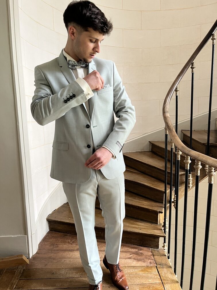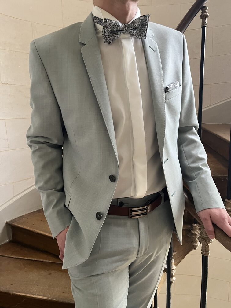 Costume vert tout doux et très tendance cette année pour accompagner toutes les tenues de ces dames ! Un joli noeud papillon et sa pochette assorti, vous voilà au top pour toutes vos cérémonies estivales !