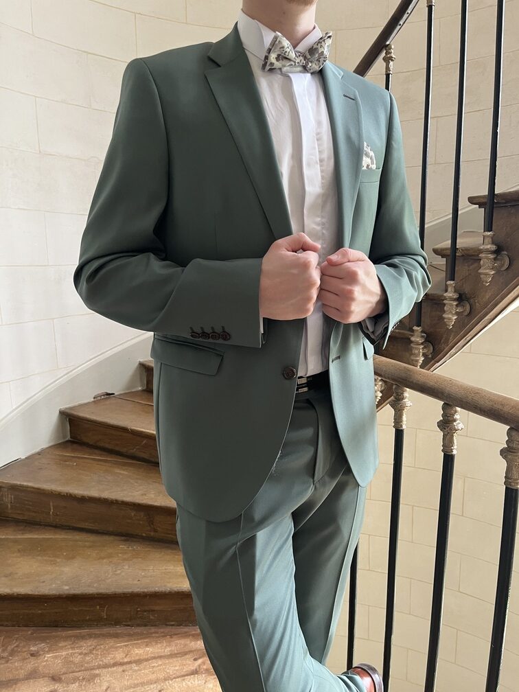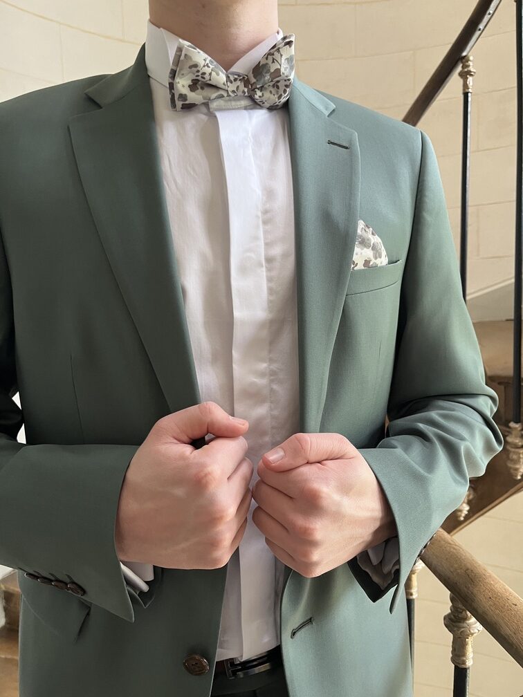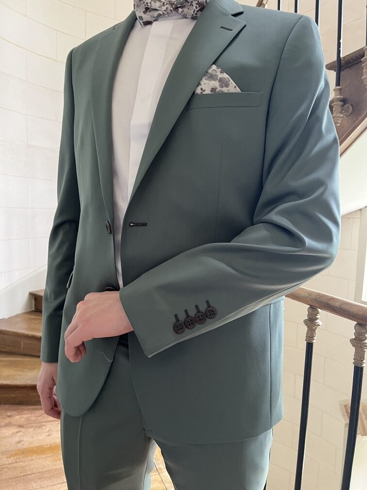Très beau costume vert céladon, pour dynamiser toutes vos cérémonies du printemps été! Du confort et de l'élégance avec une chemise col cassé blanche ou ivoire et son noeud papillon et pochette à l'imprimé fleuri ! Chaussures couleur cognac pour parfaire la tenue, et le tour est joué..